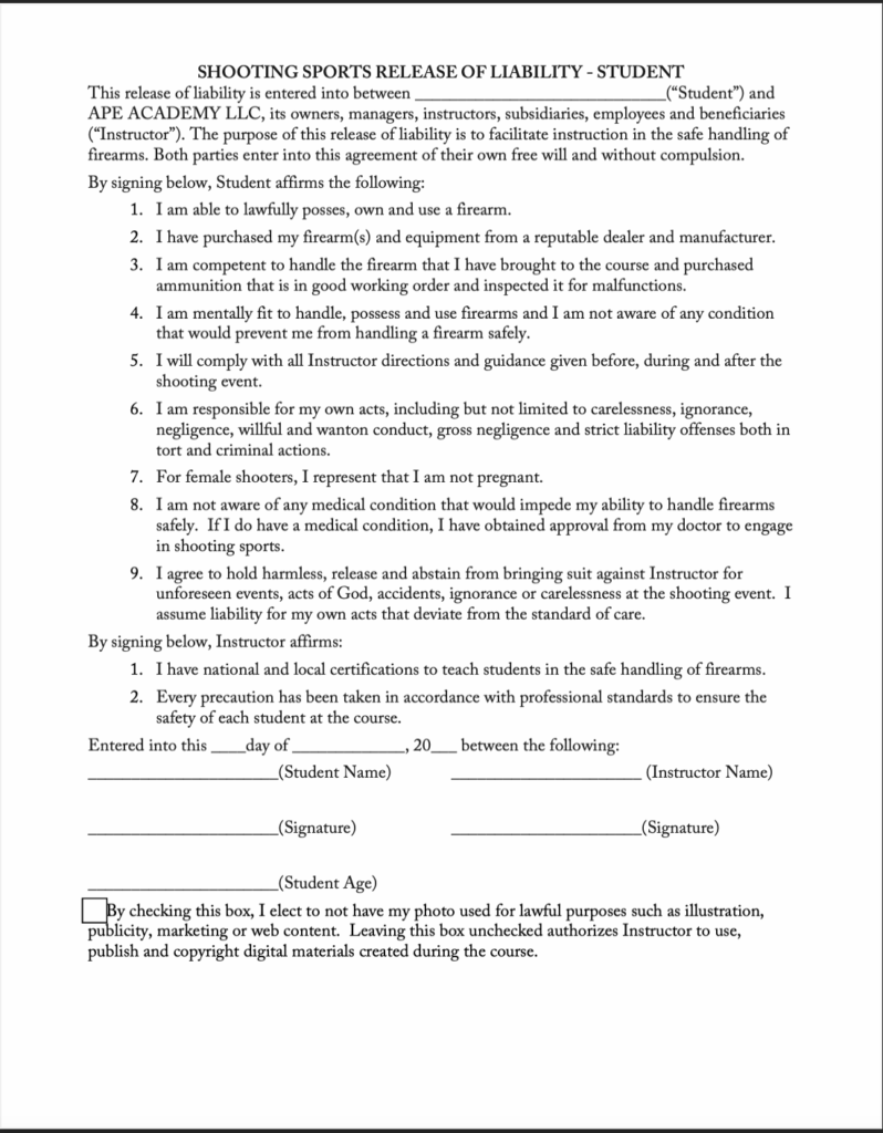If you sign up to conduct training with us, understand we are there to walk you through every step of the process with an absolute and laser focus on SAFETY FIRST. However…you will have to fill out and sign a standard Form of Indemnification, Waiver, and Release Agreement before any training can begin. This is often referred to as a Shooting Sports Release of Liability, these are typical at any range which you might train at.